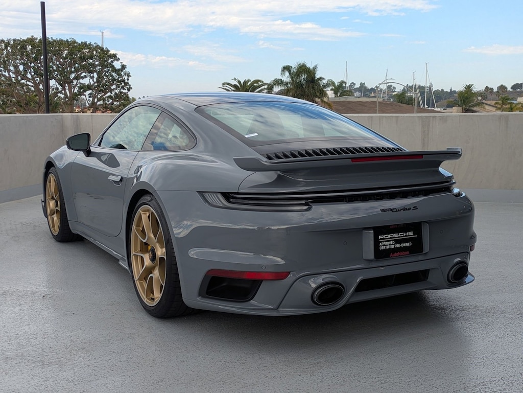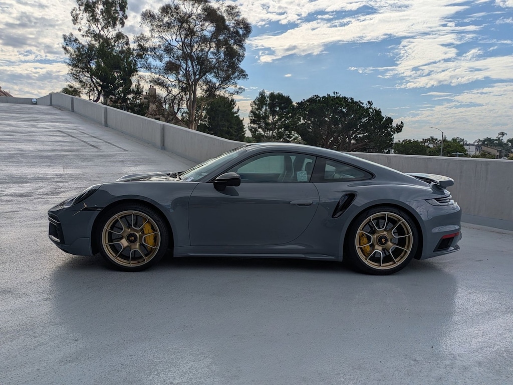 2024 Porsche 911 Turbo S — Arctic Grey over Graphite Blue, $280K MSRP, Highly Optioned, 640 hp, One Owner This 2024 Porsche 911 Turbo S is finished in Arctic Grey over a Graphite Blue leather interior and was delivered new in April 2024. Power is supplied by a twin-turbocharged 3.8-liter flat-six paired with a seven-speed PDK dual-clutch transmission and all-wheel drive. Factory equipment includes PASM Sport Suspension, Sport Exhaust System, SportDesign Package, Front Axle Lift, Burmester High-End Sound, and a range of Porsche Exclusive Manufaktur details. Factory Equipment and Options Arctic Grey Exterior ($3,270) Graphite Blue Leather Interior (FU) Carbon Fiber Roof ($3,890) 20"/21" 911 Turbo S Exclusive Design Wheels in Satin Aurum ($2,490) SportDesign Package ($6,150) Sport Exhaust System w/ Exclusive Silver Tailpipes ($3,920) PASM Sport Suspension (Lowered 10mm) ($1,510) Front Axle Lift System ($2,770) LED-Matrix Design Headlights in Black incl. PDLS+ ($750) Exclusive Design Taillights ($990) Lane Change Assist (LCA) ($1,060) Surround View ($1,430) Power Steering Plus ($280) Under Door Puddle Light Projectors ($160) Exclusive Design Fuel Cap Burmester High-End Surround Sound System ($3,980) Ventilated Front Seats ($840) Heated GT Sport Steering Wheel in Matte Carbon Fiber ($680) PDK Gear Selector in Aluminum ($750) Pedals and Footrest in Aluminum ($630) Deviated Stitching Interior Package in Racing Yellow ($3,650) — including dashboard, door panels, console lid, and knee pads White Sport Chrono Stopwatch and Central Tachometer Dials ($840 total) Ambient Lighting Package ($580) Vehicle Keys Painted w/ Race-Tex Pouch ($420) Window Trim and Mirror Bases in High Gloss Black; Mirror Caps and Intakes in Carbon Fiber (multiple exclusive options totaling ~$3,500) Model and “PORSCHE” Rear Logos in High Gloss Black ($570 combined) Total MSRP: $279,910 Performance and Driving Dynamics The 992-generation Turbo S is powered by a 3.8L twin-turbo flat-six producing 640 horsepower and 590 lb-ft of torque, sent to all four wheels via the PDK dual-clutch transmission. Porsche claims 0–60 mph in just 2.6 seconds with a top speed of 205 mph. The PASM Sport Suspension, Sport Exhaust, and Carbon Roof enhance handling and weight balance, while Power Steering Plus and Front Axle Lift maintain daily usability. Exterior and Interior Finished in Arctic Grey, this Turbo S presents a subtle yet sophisticated aesthetic enhanced by carbon fiber exterior elements and high-gloss black accents. The Satin Aurum Exclusive Design wheels provide a striking contrast, revealing ceramic composite brakes with yellow calipers behind them. Inside, the Graphite Blue leather cabin is beautifully tailored with Racing Yellow deviated stitching, carbon fiber trim, and Burmester audio. The cockpit blends motorsport intent with luxury refinement, further elevated by ventilated seats, ambient lighting, and matte carbon detailing on the steering wheel. Additional Details Warranty Start: April 13, 2024 Remaining Factory Warranty: 4 years / 50,000 miles (through April 2028) One Owner, No Modifications Includes: Window sticker, original keys, manuals, and factory accessories Summary This 2024 911 Turbo S represents the pinnacle of the 992 lineup, combining staggering performance with bespoke aesthetic refinement. With nearly $50K in factory options, an exclusive Arctic Grey / Graphite Blue specification, and an impeccable condition, it stands as a collector-quality example of Porsche’s ultimate daily supercar.